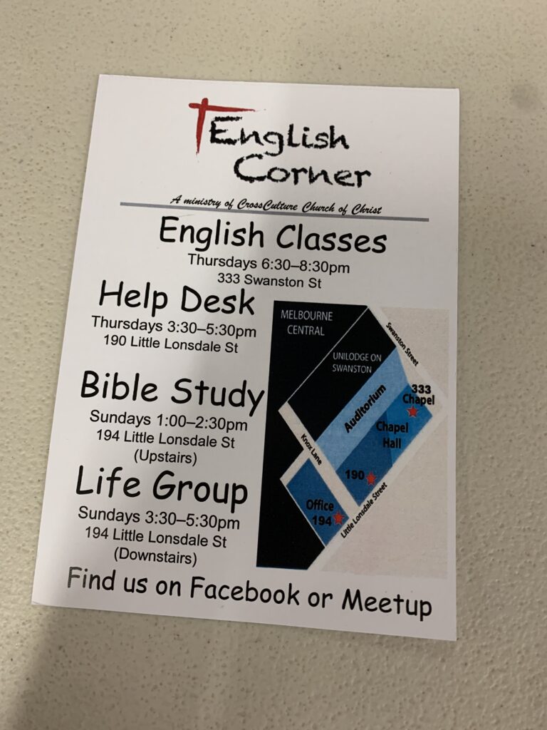 English Cornerという英語初学者向けの無料英語レッスンのようなものでした。私は毎週のそのイベントの常連となり、友達もできました。