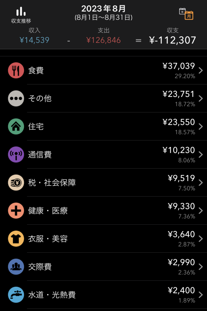 支出は以下の通りです。毎月3万円程度の赤字です。これでも安定期の話であり、事業出資が必要な場合や、京都へ引っ越した初期の頃を支出はかなり膨らんでいました。